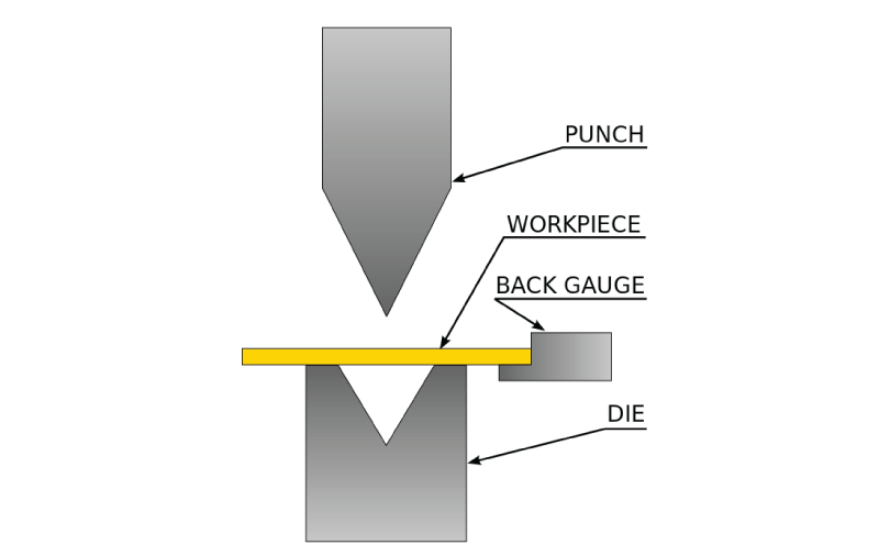 Press brake machines, also called brake presses or brakes, are a type of machine that is used to bend sheet metal. The sheet metal created can be used for dies and punches. A press brake has two main components composed of an upper and lower unit. The upper unit is composed of an upper beam, a punch holder, and punch. The punch holder attaches to the upper beam and holds a variety of punches. The punches attach to the punch holder and have a relief shape that allows sheet metal to bend. The most common shape of this mechanism is a V. Punches can be categorized by their tip angle, relief shape and installed height.  The downward action of the upper beam allows energy to move and transfer the energy to the work piece. The two sections come together and bend sheet metal between the two unit.